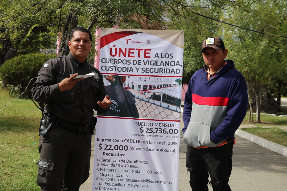 Ciudad Victoria, Tamaulipas.- En cumplimiento al compromiso de incrementar el personal de los Cuerpos de Vigilancia, Custodia y Seguridad, la Secretaría de Seguridad Pública de Tamaulipas (SSPT) lleva a cabo una campaña de reclutamiento a través de medios electrónicos y con presencia en lugares físicos.