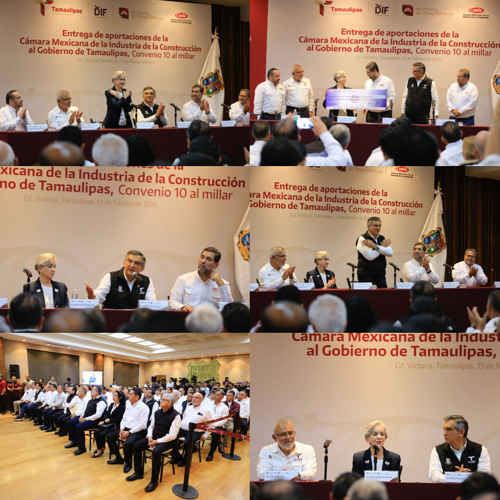 Ciudad Victoria, Tamaulipas.- El gobernador Américo Villarreal Anaya y la presidenta del Sistema DIF Tamaulipas, doctora María de Villarreal, recibieron una aportación de más de 16 millones 573 mil pesos de parte de las y los empresarios afiliados a la Cámara Mexicana de la Industria de la Construcción, (CMIC), como parte del convenio de colaboración “10 al Millar”, los cuales se destinarán a proyectos para rehabilitar centros de atención a personas con problemas de salud mental en el estado.