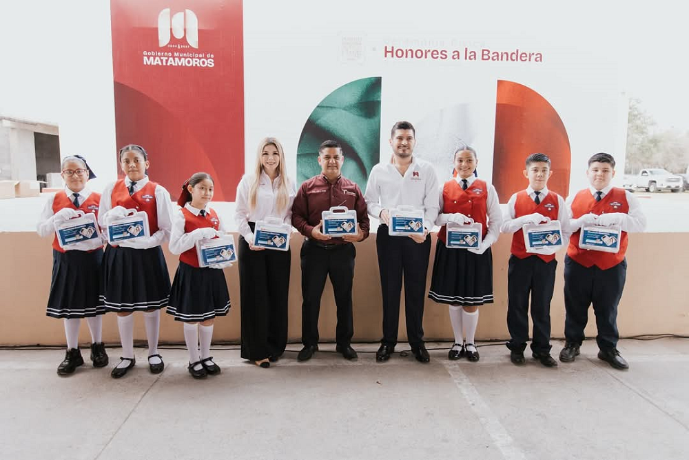 Matamoros, Tamaulipas.- El alcalde de Matamoros, Alberto Granados Fávila, encabezó la ceremonia de honores a la bandera en la primaria María Isabel Mata Alvarado, donde además supervisó la obra de una aula de usos múltiples, reforzando su compromiso con la educación en el municipio.