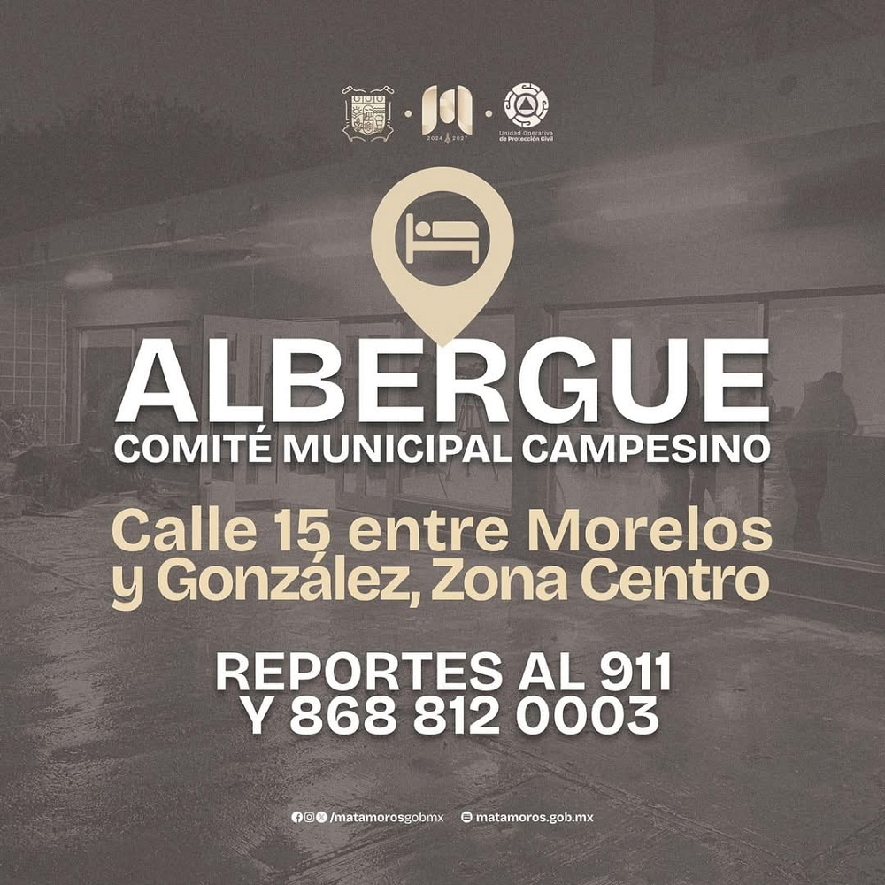 H. Matamoros, Tam. – Debido al impacto del Frente Frío que afecta nuestra región, se ha habilitado un albergue temporal en el Comité Municipal Campesino, ubicado en Calle 15 entre González y Morelos, en la zona centro, informó el alcalde Beto Granados.