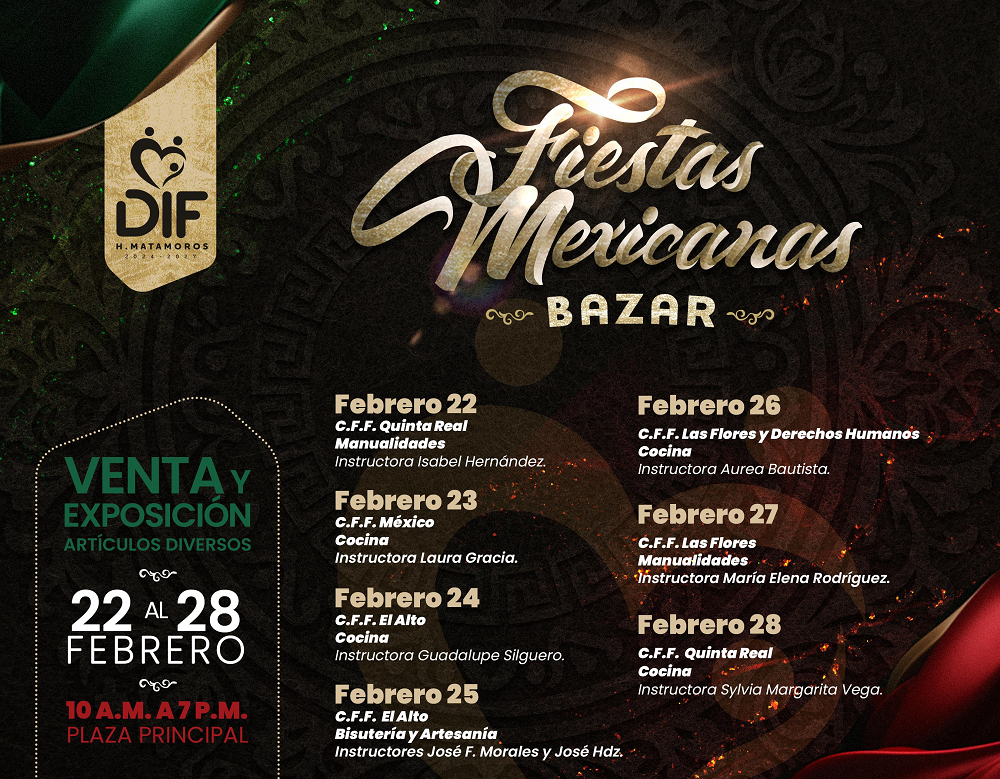 El Gobierno Municipal y el Sistema DIF Matamoros que preside la Lic. Ana Ariceaga de Granados invitan a la población a disfrutar del Bazar Fiestas Mexicana; un evento familiar en donde se exhibirán y pondrán a la venta diversos artículos representativos de estas festividades.