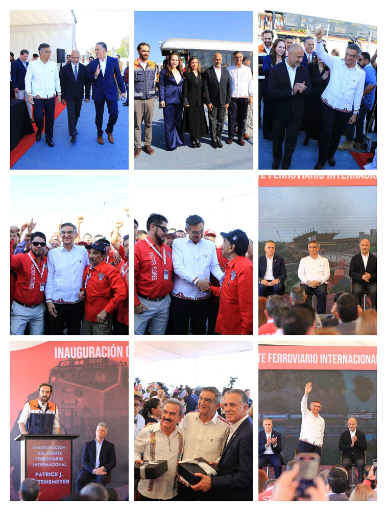 Nuevo Laredo, Tamaulipas. - El gobernador Américo Villarreal Anaya y el secretario de Infraestructura, Comunicaciones y Transportes, Jesús Antonio Esteva Medina, junto con directivos de la empresa Canadian Pacific Kansas City, inauguraron en esta ciudad el puente ferroviario internacional Patrick J. Ottensmeyer, que permitirá duplicar el intercambio comercial entre el corazón industrial de México con Estados Unidos y Canadá.