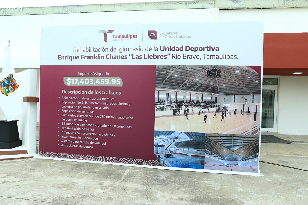 Río Bravo, Tamaulipas.- Con una inversión de más de 17 millones de pesos y en respuesta a una petición de la comunidad deportista de Río Bravo, el gobernador Américo Villarreal Anaya entregó esta tarde la obra de rehabilitación del gimnasio de la Unidad Deportiva Enrique Franklin Chanes "Las Liebres". Junto a la doctora María de Villarreal, presidenta del Sistema DIF Tamaulipas, el gobernador aseguró que la entrega de esta obra es un ejemplo del trabajo que realiza el Gobierno del Estado para recuperar la infraestructura deportiva que estuvo abandonada por otras administraciones.