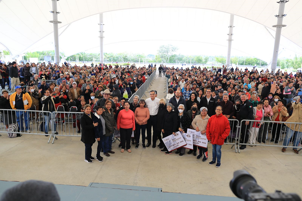 Acompañado por la presidenta del DIF Estatal, doctora María de Villarreal, el gobernador presidió la entrega de la primera remesa de tarjetas 2025 del programa Pensión Mujeres Bienestar, en la velaria de la Expo Tampico, donde destacó que en el presente año Tamaulipas se suma a los tres nuevos programas sociales que impulsa la presidenta de México.